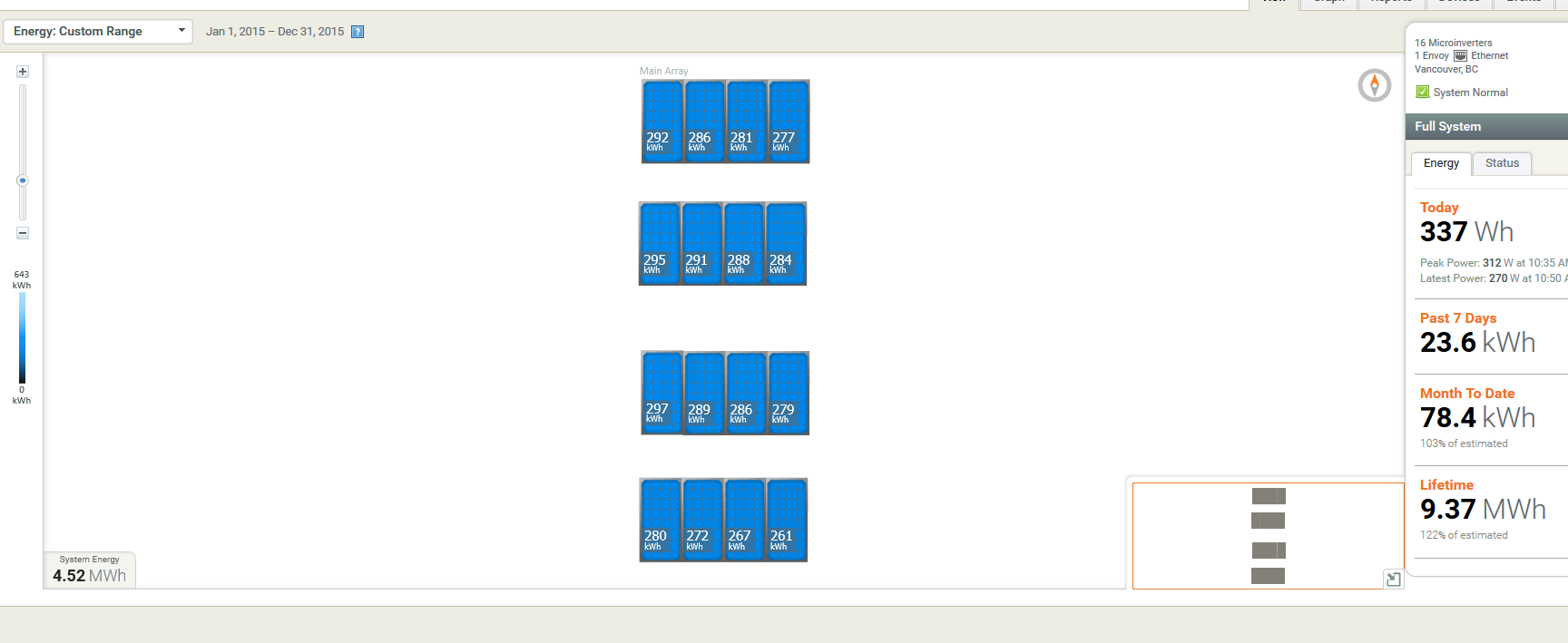 Below is a screenshot showing the annual performance of another systm located in the City of Vancouver. This one does receive some shading from nearby trees – that is why the panels in the lower right are producing less than those in the upper left. Even so this 4.0 kW system generates 1,120 kWh / kW annually: