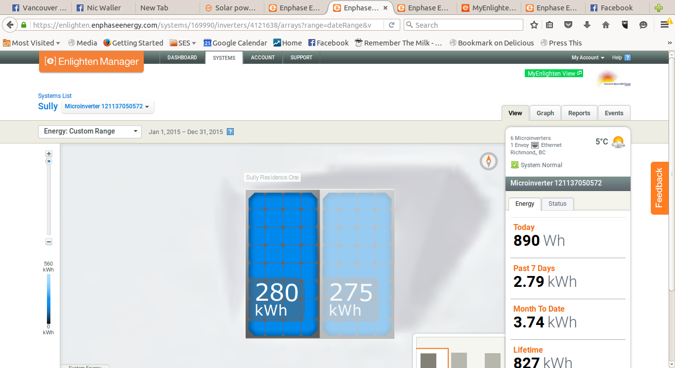 Posted by karen in News, Our News, on February 18, 2016We are often asked how much solar energy can be generated in Vancouver from a nominal kW of photovoltiac modules. Our best preforming system in the Lower Mainland is located in Richmond and generates 1,280 kWh / kW. The owner of the system has not made the detailed data available online publicly. But here is a screenshot of the annual performance of the 218 W modules: