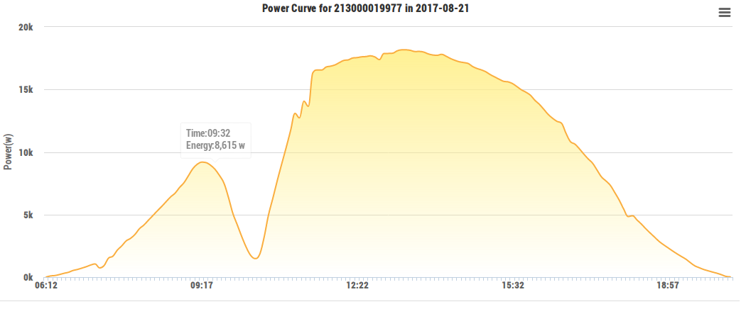 One of the more unique methods of “viewing” the eclipse is to watch the real-time monitoring from a solar energy systems along the eclipse path. Below is a graph from one of the dozens of systems we have installed in BC. Notice the smooth downward curve as the moon blocks the sun.